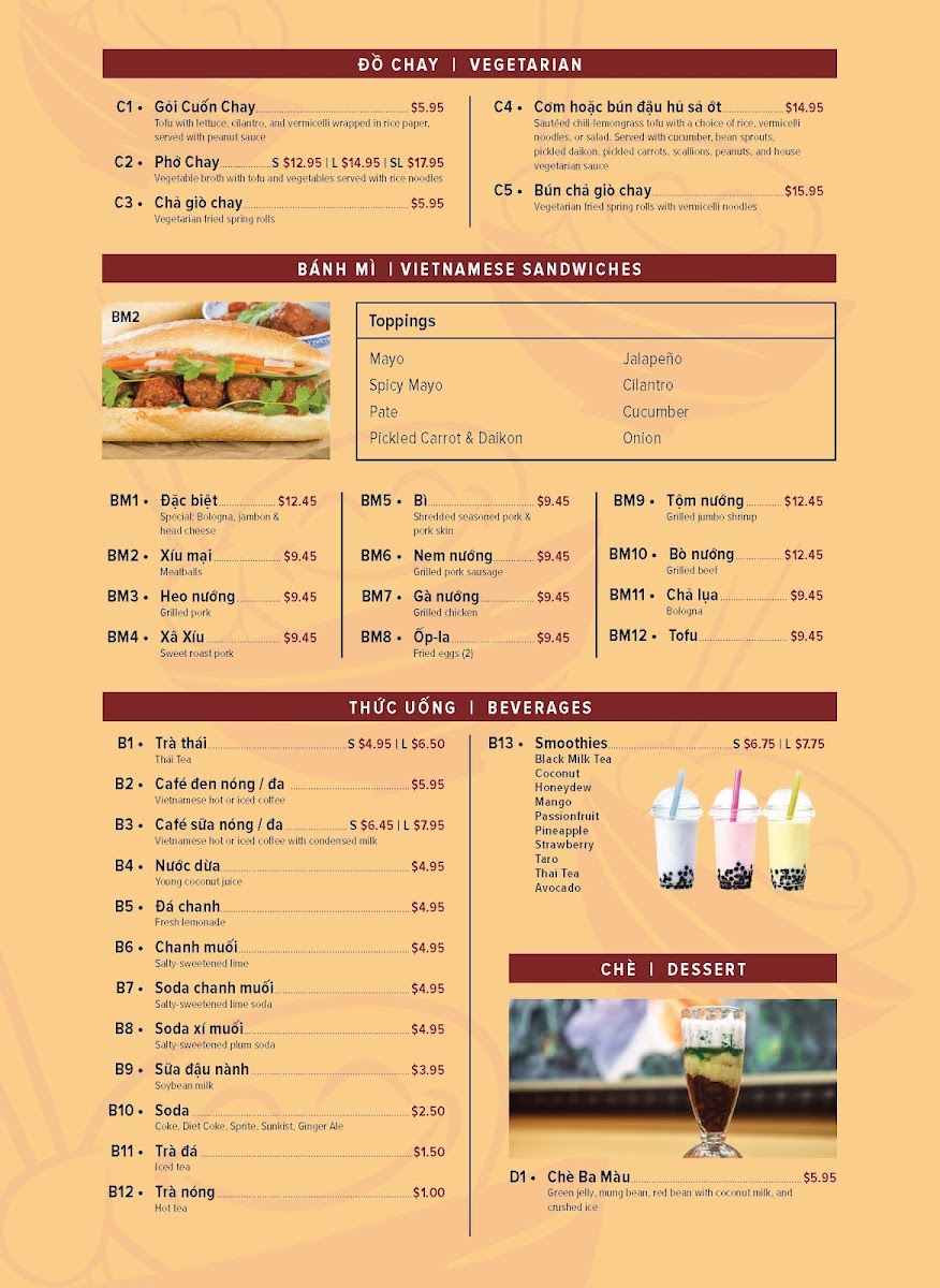 Vietnamese beef stew, served with a choice of French baguette, egg noodles, or rice noodles (one size)